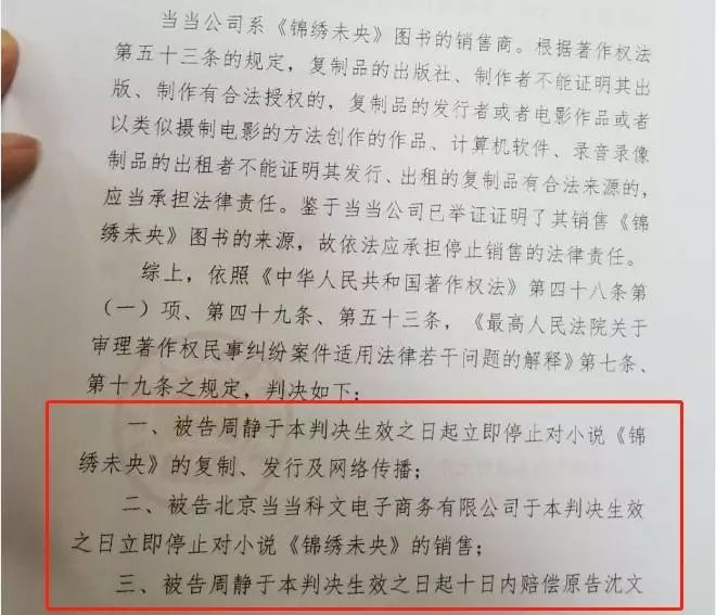 王国华告诉每经记者,5月8日北京市朝阳区人民法院知识产权庭依法对“沈文文诉周静及当当网案件”公开宣判。被告周静侵权成立,判决生效之日起10日之内赔偿原告沈文文经济损失12万元及维权开支1.65万元,共计13.65万元。同时,被告周静还需在判决生效之日起立即停止对小说《锦绣未央》的复制、发行及网络传播;被告当当网于判决生效之日立即停止对小说《锦绣未央》的销售。