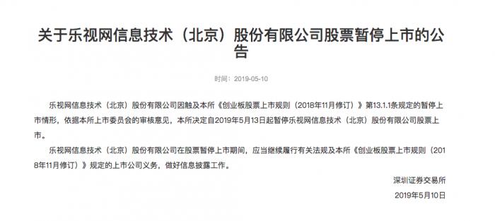 5月10日,深交所发布公告称,乐视网信息技术(北京)股份有限公司因触及本所《创业板股票上市规则(2018年11月修订)》第13.1.1条规定的暂停上市情形,依据本所上市委员会的审核意见,本所决定自2019年5月13日起暂停乐视网信息技术(北京)股份有限公司股票上市。