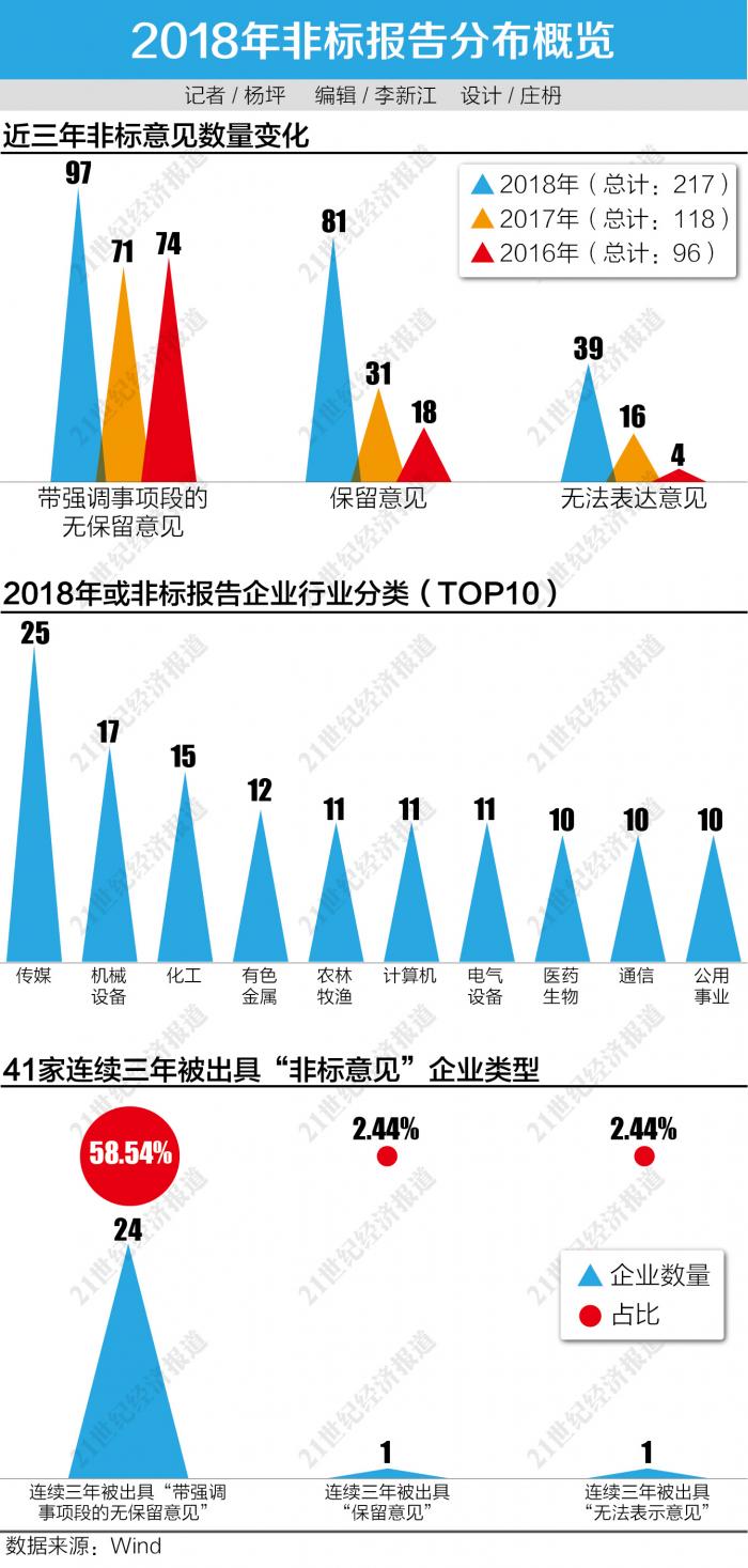 2018年年报被审计机构出具“非标意见”的上市公司数量,已高达217家,占已披露年报企业的比例达到6.02%, 2016年和2017年被出具非标意见的上市公司分别才96家和118家。