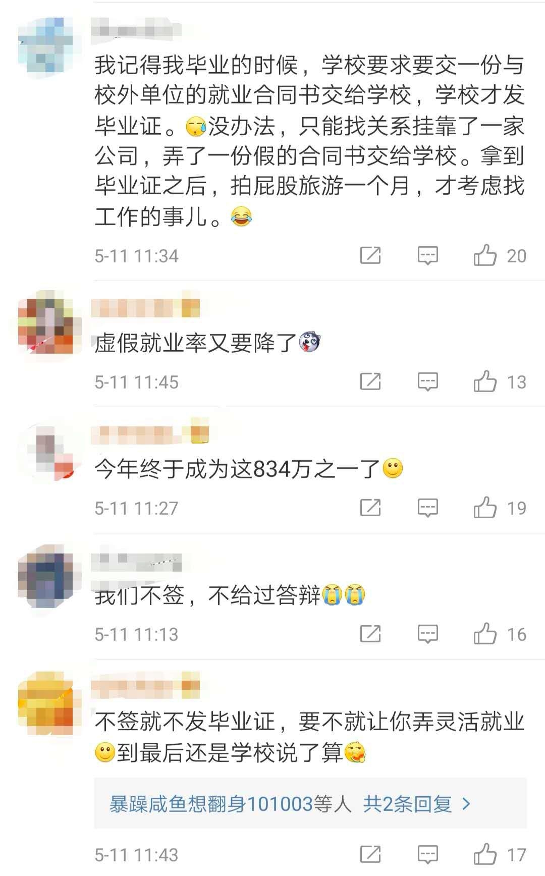 据教育部官网,2019届全国普通高校毕业生834万人。当前,正值毕业生就业签约的高峰期,媒体发现仍有个别高校要求所有毕业生必须签署就业协议或提供就业证明,暗示就业证明材料将作为论文答辩或证书发放的条件,严重损害毕业生权益,造成不良社会影响。