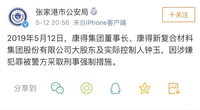 据张家港市公安局消息,5月12日,康得集团董事长、康得新复合材料集团股份有限公司大股东及实际控制人钟玉,因涉嫌犯罪被警方采取刑事强制措施。