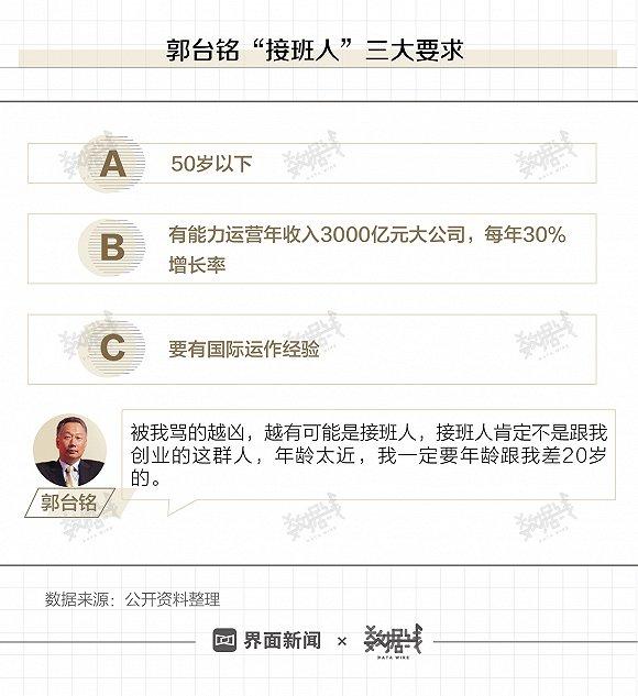 2008年郭台铭曾公布接班人3大要求。此后又针对接班人问题,多次表态:“长子郭守正和侄子、侄女绝对不会接事业,这些年轻人都有共通的毛病”,“被我骂的越凶,越有可能是接班人,接班人肯定不是跟我创业的这群人,年龄太近,我一定要年龄跟我差20岁的。”