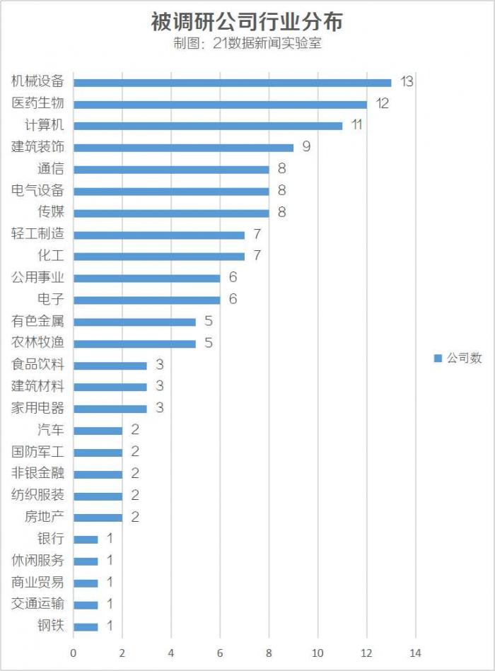 从行业分布来看,过去一周机构对机械设备、医药生物类的热度不减,已连续数周进行调研,计算机行业亦深受青睐,均有10家以上的公司被调研。