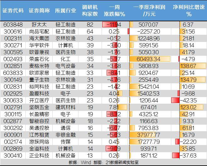 此外,尚品宅配(300616.SZ)、海大集团(002311.SZ)等公司也备受机构关注,接待机构数分别为:64家、43家。