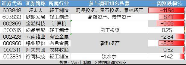 值得注意的是,据21数据新闻实验室统计,共7家知名百亿私募参与了调研,热情高涨,主要聚焦8家上市公司,其中来自家居行业的3家公司最受青睐:好太太(603848.SH)、尚品宅配(300616.SZ)、欧派家居(603833.SH)。