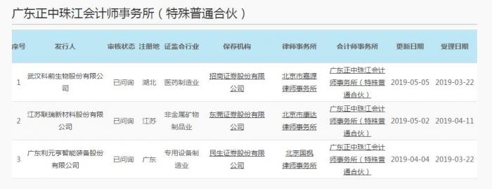 目前由正中珠江担任会计师事务所的科创板申报企业共有3家,分别是科前生物、联瑞新材、利元亨智能。