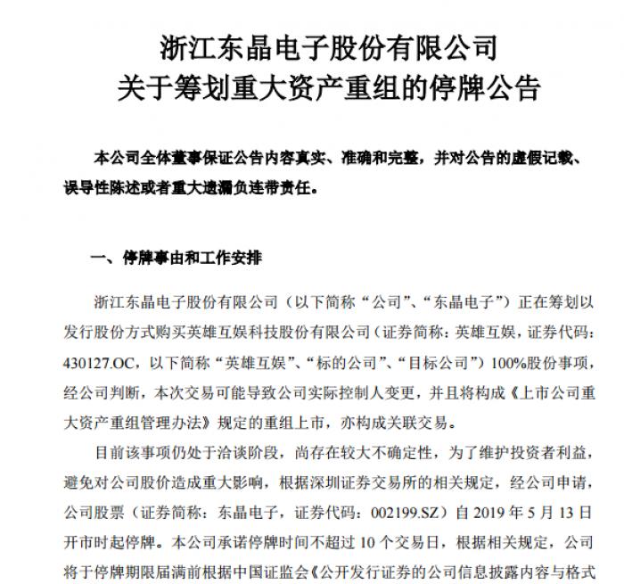 5月13日中午,东晶电子(002199.SZ)发布公告表示,已经于英雄互娱主要股东签订《重组上市框架协议》,拟吸收合并英雄互娱,同时置出自身全部资产业务。
