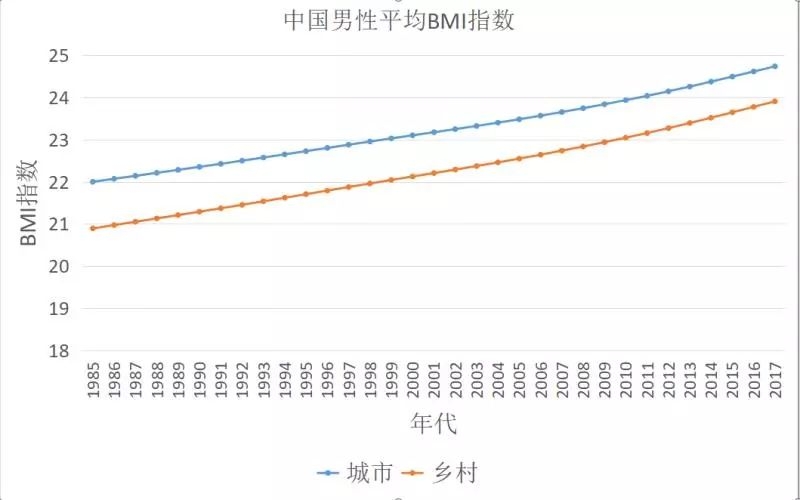 南方周末发现,30年来中国城乡人口BMI指数均在增长,城市男女平均BMI高于农村同龄人,但随着时间推移,农村BMI增长速度快于城市,女性的上升速度更为显著。