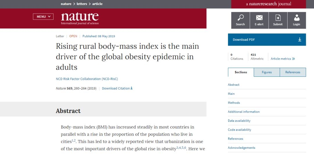 《自然》发表的一项研究指出,农村地区持续上升的BMI(身体质量指数),是导致过去33年中低收入、中等收入地区以及整个世界BMI上升的最大元凶,这一研究也颠覆了城市生活方式是全球肥胖流行因素的主流观点。