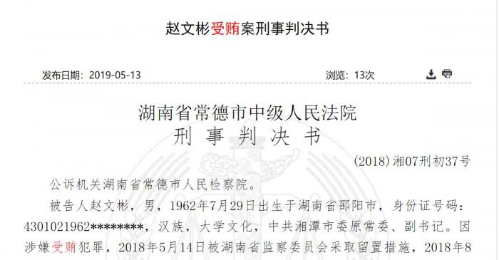 湖南省湘潭市委副书记赵文彬受贿2357万余元,3月27日被判刑13年半。中国裁判文书网5月13日发布了赵文彬案判决书,其中显示,赵文彬最大的一笔受贿是收受了一套价值1448万余元的别墅。
