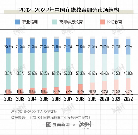 从细分市场结构来看,2012年时,高等学历教育和职业培训几乎占了整个在线教育行业的90%。但2018年,高等学历教育占比降至53.3%,职业培训需求则依旧旺盛,保持在24.8%。此外,K12教育快速增长,占比在6年时间内几乎翻倍,但依旧与职业培训和高等学历教育存在一定差距。