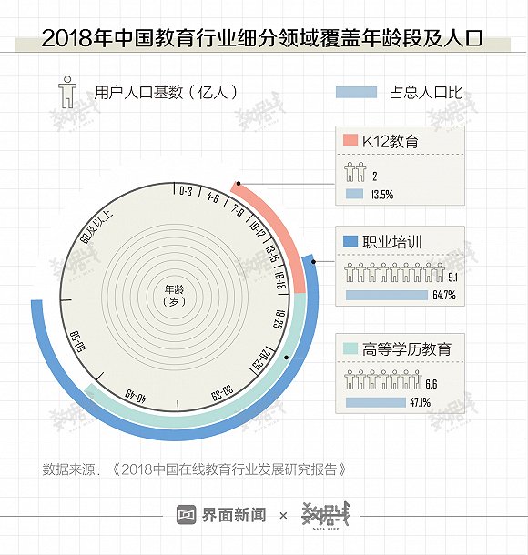 成人自控力强、学习目标明确、空闲时间有限,加上庞大的人群基数,是在线教育的主要用户群体。从覆盖用户年龄段来看,职业培训比高等学历教育和K12教育的覆盖面更广,覆盖用户人口基数达9.1亿,占总人口比近2/3。