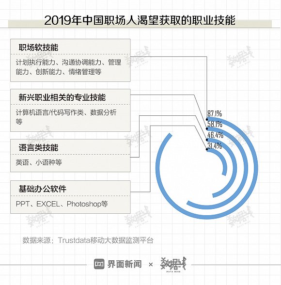 学习热情高、付费意愿强的中国职场人更渴望学到哪些技能?《2019中国白领从业者职业发展趋势及需求分析报告》数据显示,87.1%的受访者渴望获取包括计划执行、沟通协调、创新能力和情绪管理在内的职场软技能。新兴技术相关专业技能和语言类技能分列二三。