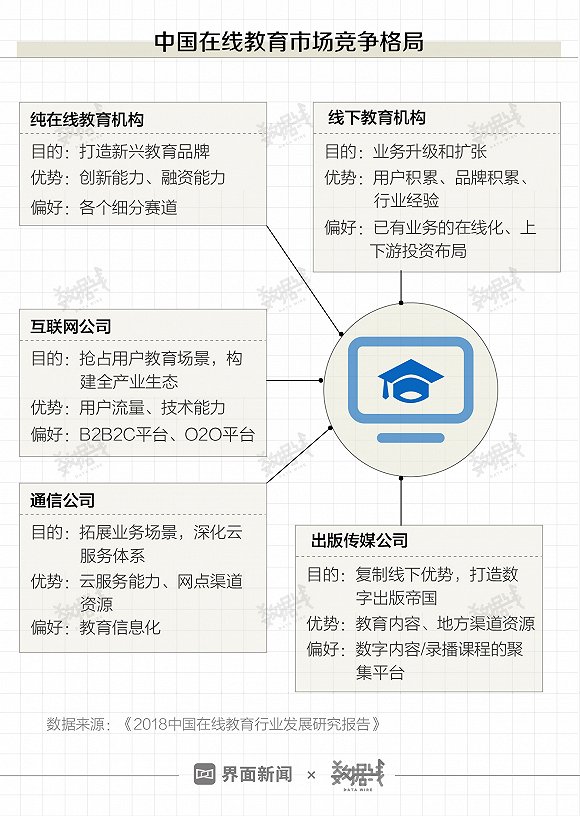 面对在线教育这块大蛋糕,动心的不只有教育机构。互联网公司利用流量优势和技术能力入局,通信公司则为拓展业务线而进入在线教育市场,出版传媒公司为打造数字出版帝国加入竞争。