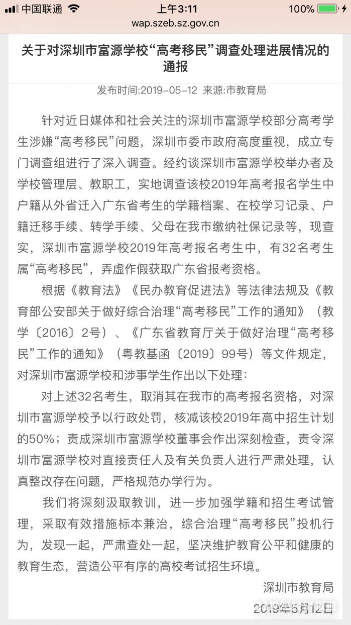 5月12日深夜,深圳教育局通报了此前备受关注的“高考移民”事件调查结果,32名考生被取消了在深圳报名高考的资格,此外,核减富源学校2019年高中招生计划的50%。