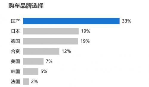 性价比依然是消费者购车的首要考虑因素。报告显示,由于国产车的品牌实力不断提升,在同等价位下,国产车具有更高配置,因此一季度33%的购车者倾向选择国产车作为代步工具,与此同时,选择日本、德国、美国品牌的购车者占比分别为19%、19%和7%。这意味着国产品牌已成为消费者购车首选。