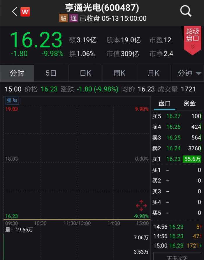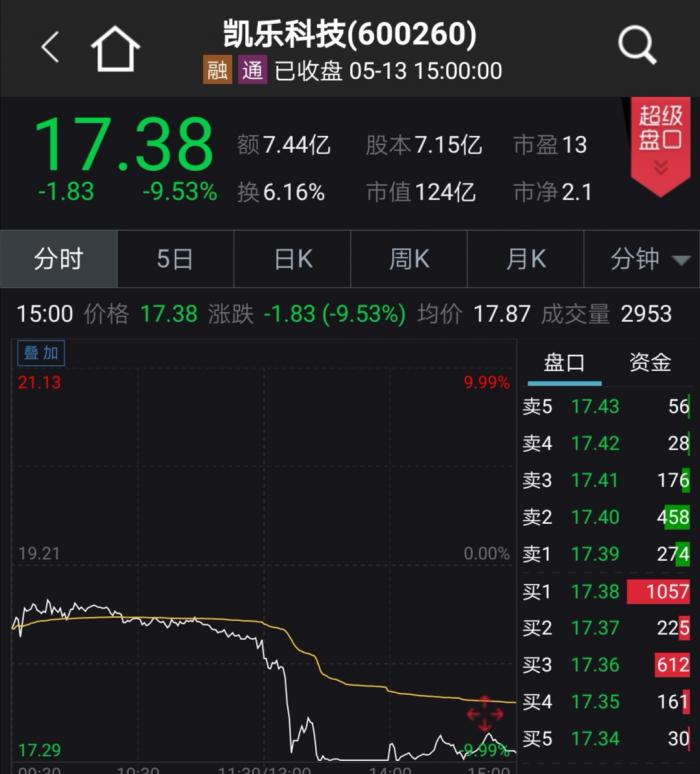 5月13日,亨通光电一字跌停,被疑与其联系密切的凯乐科技午后一度跌停,尾盘有所收窄,跌幅为9.53%。