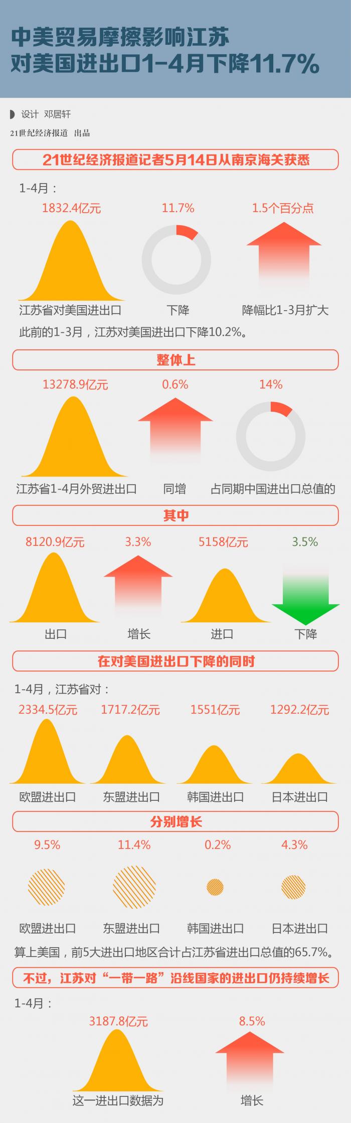 21世纪经济报道记者5月14日从南京海关获悉,1-4月,江苏省对美国进出口1832.4亿元,下降11.7%,降幅比1-3月扩大1.5个百分点。此前的1-3月,江苏对美国进出口下降10.2%。