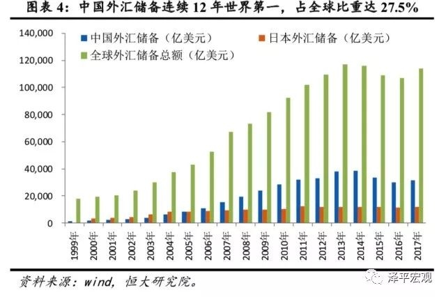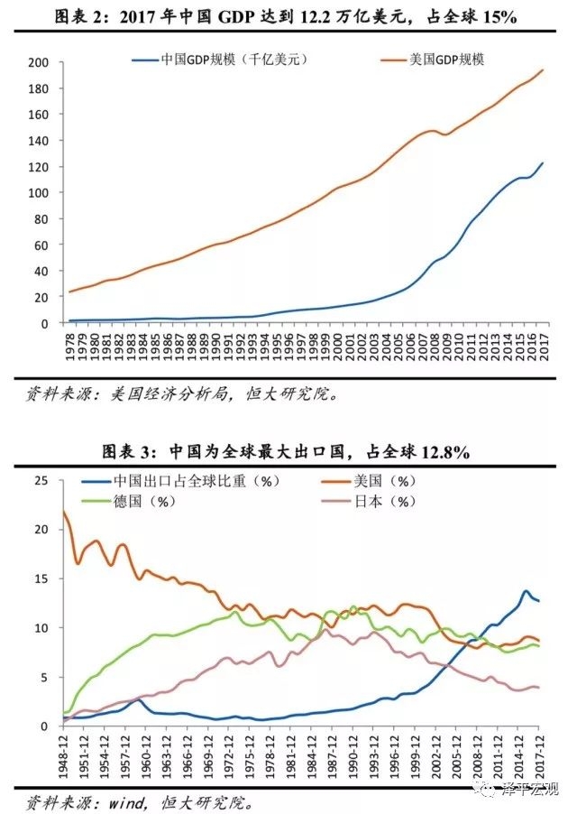 以中国的经济成就为例,改革开放四十年来中国经济年均增长9.5%,创造了人类历史上大型国家经济增长的奇迹;2017年中国GDP规模达到82.7万亿元(12.2万亿美元),占全球比重15%,为世界第二大经济体,对全球经济增长贡献30%;2017年中国出口达到22634亿美元,为世界第一大出口国,占全球出口总额12.8%(美国占比8.7%,德国占比8.2%,日本占比3.9%);2017年底中国外汇储备达到3.14万亿美元,连续12年居世界第一,占全球储备比重为27.5%(第二大储备国日本1.2万亿,占全球比重10.5%)……