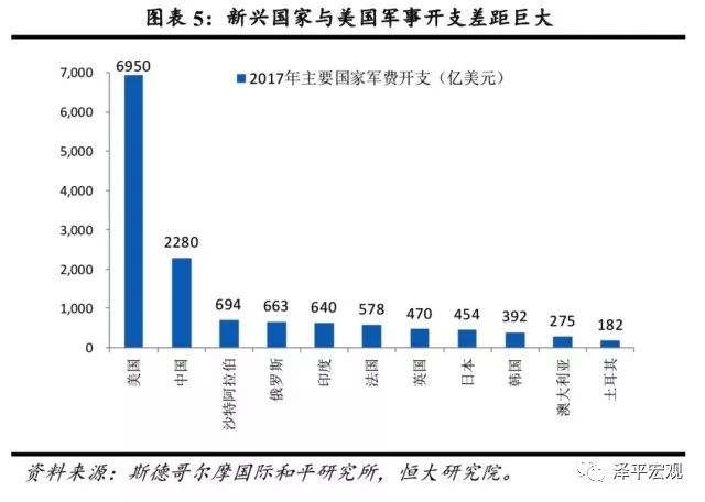目前来看,新兴国家的崛起在很大程度上是以经济大国的身份崛起,其政治影响力、军事实力相对于经济实力而言还存在很大差距。根据瑞典斯德哥尔摩国际和平研究所的数据,2017年美国军费开支为6950亿美元,占全球40%,远远超过排在其后的中国2280亿美元、沙特694亿美元、俄罗斯663亿美元、印度640亿美元、法国578亿美元、英国470亿美元、日本454亿美元。