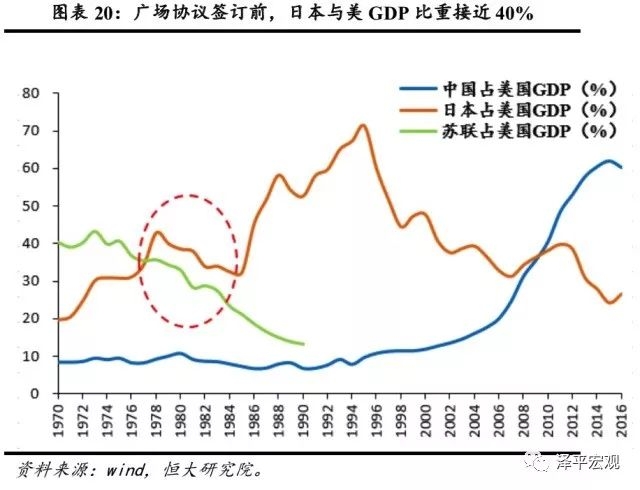 广场协议签订前,日本GDP占美比重接近40%;中国当前GDP占美比约60%。按照6%左右的GDP增速再增长十年左右,即大约在2027年前后,中国有望取代美国、成为世界第一大经济体。