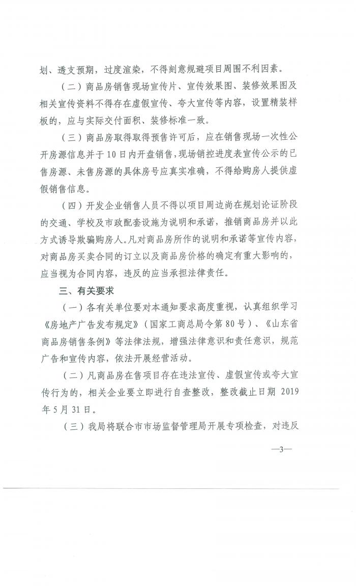 《通知》还指出,济南市住建局和市场监管局将联合市市场监督管理局开展专项检查,对违反本通知规定的房地产开发企业和中介机构,将责令其限期改正,逾期不改正的停止销售行为,不良行为记入企业信用档案,并视情进行通报,情节严重的将依法予以处罚。