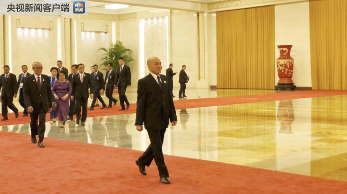 △前来与习近平会面的柬埔寨国王西哈莫尼。(央视记者许永松拍摄)
