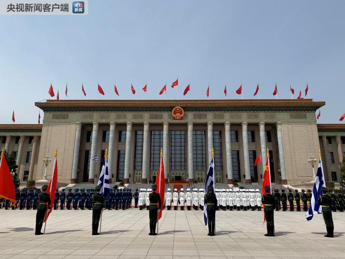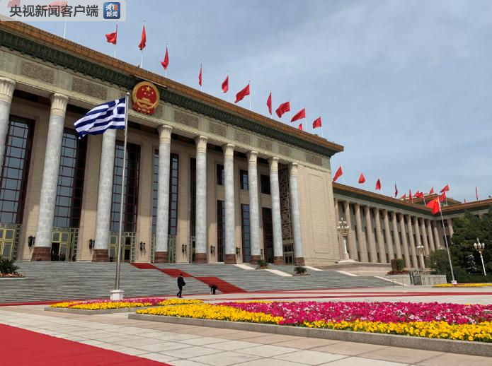 △希腊国旗在人民大会堂东门外广场升起,欢迎希腊总统的仪式即将开始。(央视记者段德文拍摄)