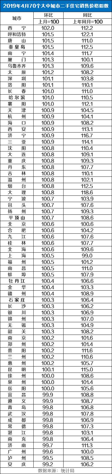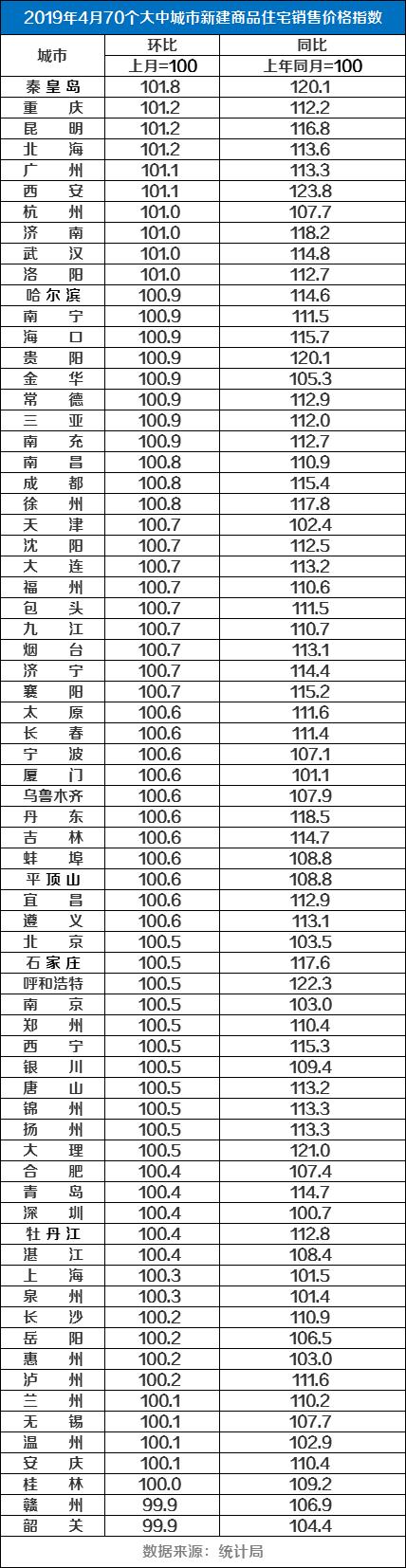 国家统计局今日发布了2019年4月份70个大中城市商品住宅销售价格变动情况统计数据。