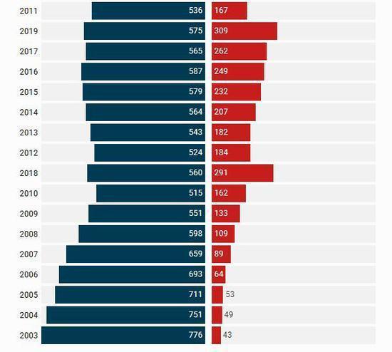 与2003年《福布斯》第一次发布该榜单时相比,中国企业上榜数量大幅增加。当年,美国有776家公司上榜,而中国只有43家。