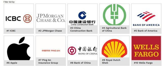 数据显示,2019年全球上市公司2000强前十名,中国共有5家入围,中国工商银行连续第七年高居榜首。中国建设银行、中国农业银行、中国平安、中国银行分别位居第三、第四、第七、第八名。
