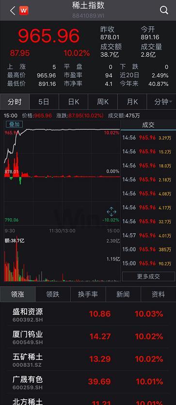 “稀土”概念今日掀起涨停潮,Wind稀土指数开盘不久即直冲涨停,盛和资源、厦门钨业、五矿稀土、广晟有色、北方稀土等稀土概念股系数涨停。