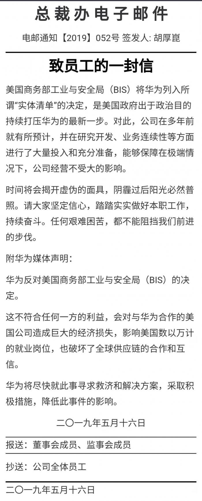 当天,华为轮值董事长胡厚崑在内部发布的《致员工的一封信》中表示,这是美国政府处于政治目的持续打压华为的最新一步。“对此,公司在多年前就有所预计,并在研究开发、业务连续性等方面进行了大量投入和充分准备,能够保障在极端情况下,公司经营不受大的影响。”