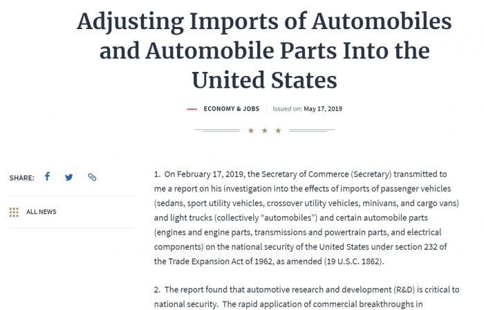 此前在今年的2月17日。美国商务部向总统特朗普提交了针对进口汽车及零部件对美国国家安全影响的“232调查”报告,特朗普原本须在本周六决定是否加征关税。值得注意的是,有外媒援引分析人士认为,推迟汽车关税的决定或是为了避免美国陷入“多线作战”的局面,破坏其与欧盟、日本之间正在进行的贸易谈判。