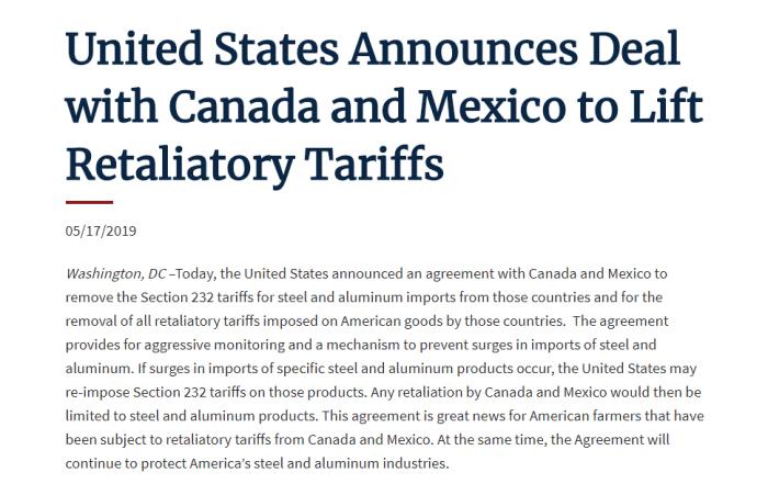 近一年前,美国以国家安全的名义,对加拿大和墨西哥产钢铁和铝分别加征25%和10%的关税,引发两国对美国农产品和其他产品的报复性关税。由于这些关税的存在,也为三国立法者拒绝批准新贸易协定留下了隐患。