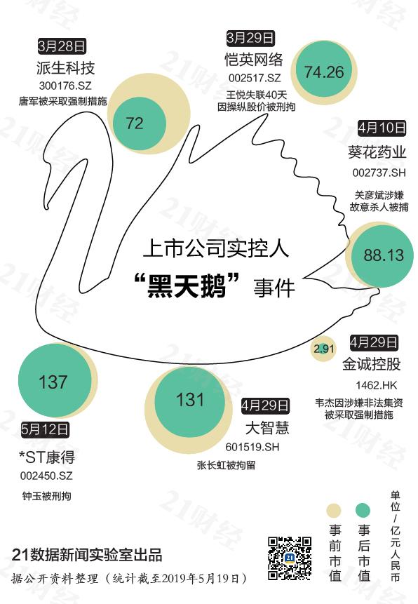 据21数据新闻实验室统计,包括*ST康得在内,不到两个月已至少有6家上市公司的实控人爆雷,而这6家公司在事件爆出后,市值合计蒸发了近300亿,牵涉投资者总数超过50万。