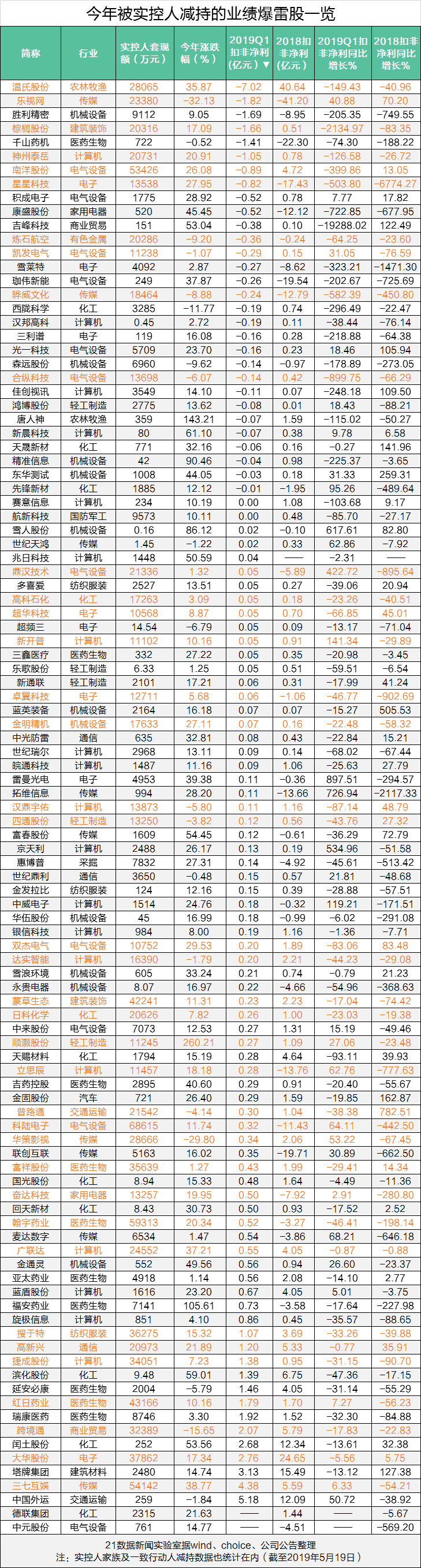 21数据新闻实验室对上述175家公司进一步分析发现,基本都是在最近十年上市,92%来自中小创,2018年或者2019年一季度扣非净利润出现亏损或下滑的公司更是占了6成以上,乐视网(300104.SZ)、千山药机(300216.SZ)等被暂停上市个股赫然在列。