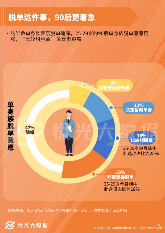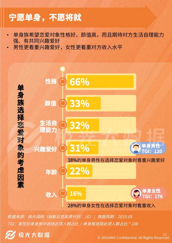极光大数据(Aurora Mobile, NASDAQ: JG) 在520这个有着特殊含义的日子,针对18-34岁的单身群体进行数据调研与分析,推出《2019单身人群专题研究报告》,从单身原因、婚恋期待以及单身生活状态等方面剖析单身青年的情感状态。看完本文,你会明白单身青年们的需求与期待。