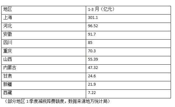 今年一季度,全国累计新增减税3411亿元,从部分已经公布一季度减税降费情况的地区看,上海市的额度最高,达到了301.1亿元,此外河北、安徽、四川和重庆皆超70亿元。