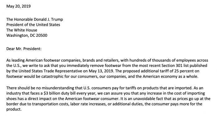 周一,美国鞋类经销和零售商协会(The Footwear Distributors & Retailers of America)在其网站上发布了一封致总统公开信。这个总共有173家公司的协会是美国整个行业的代表,除了耐克、阿迪外,还包括Under Armour、Crocs等中国消费者喜爱的品牌。