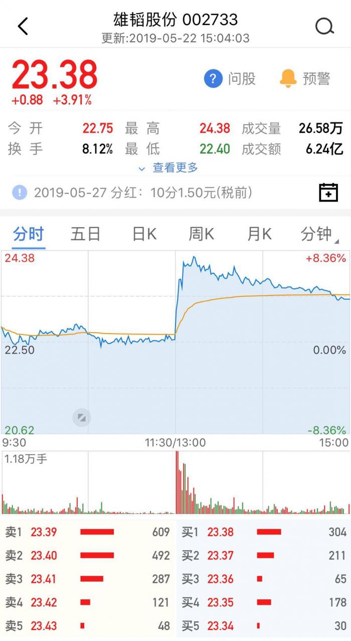 受此消息影响,雄韬股份午后开盘股价直线飙升,一度大涨近8%。不过,截至收盘,其涨幅收窄至3.91%。