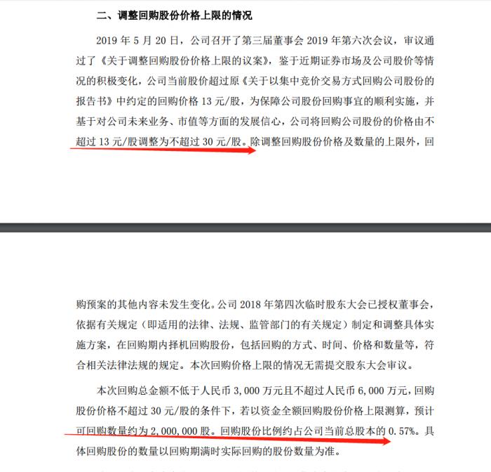 公告称,2019年5月20日,公司召开了第三届董事会2019年第六次会议,审议通过了《关于调整回购股份价格上限的议案》,鉴于近期证券市场及公司股价等情况的积极变化,公司当前股价超过原《关于以集中竞价交易方式回购公司股份的报告书》中约定的回购价格13元/股,为保障公司股份回购事宜的顺利实施,并基于对公司未来业务、市值等方面的发展信心,公司将回购公司股份的价格由不超过13元/股调整为不超过30元/股。除调整回购股份价格及数量的上限外,回购预案的其他内容未发生变化。