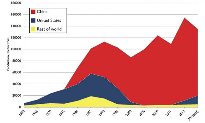 (世界稀土生产分布 红色:中国 蓝色:美国 黄色:其他 来源:加州伯克利大学)