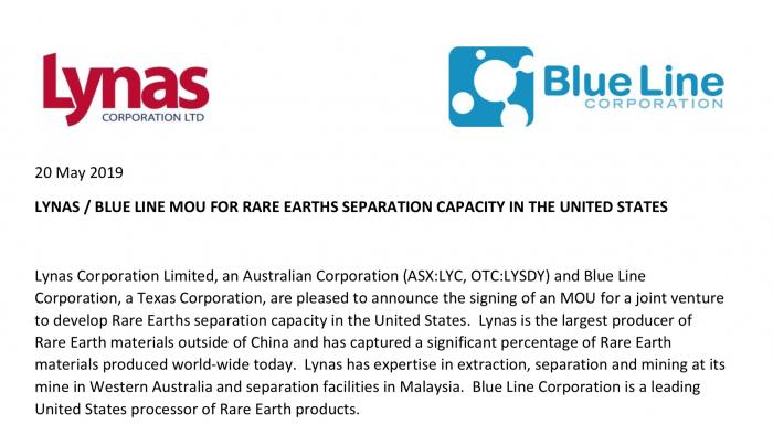 据Lynas公司5月20日发布的声明指出,已与美国Blue Line公司签署了谅解备忘录,双方将在美国得克萨斯州成立合资企业,并建立一家稀土分离厂,Lynas将成为该合资公司的控股方,双方将在未来一年内推进相关合作的落地。