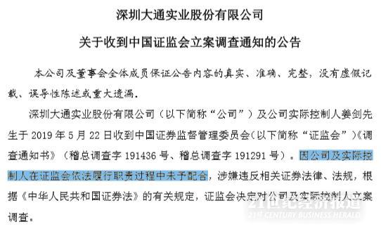 深大通在公告中称,因公司及实际控制人在证监会依法履行职责过程中未予配合,涉嫌违反相关证券法律、法规,证监会决定对公司及实际控制人姜剑立案调查。