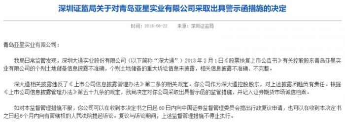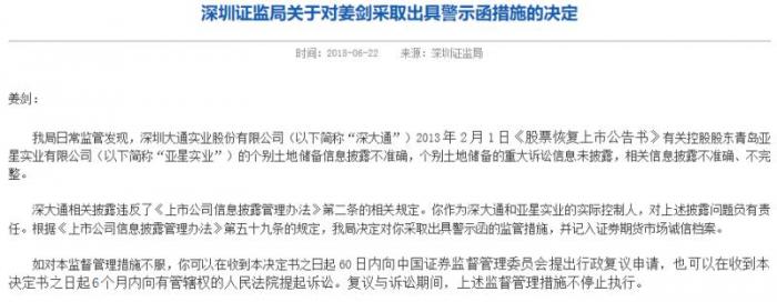 21世纪经济报道记者查询发现,在2018年6月,深大通及其实际控制人姜剑、姜剑控制的青岛亚星实业有限公司,因相关信息披露不准确甚至未披露,同时被深圳证监局采取出具警示函的监管措施,并记入诚信档案。