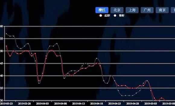 湖北潜江最大的小龙虾交易市场平台“虾谷360”的价格监测图显示,6-8钱的青、红小龙虾批发价格在4月18日为45元左右,至5月2日已经跌至38元,这一平台并未显示出最新交易报价。