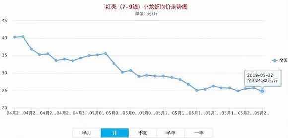 而小龙虾价格网则给出了5月22日的最新报价,大红小龙虾的全国平均价格在24.82元——相比较的话,价格下降近50%。