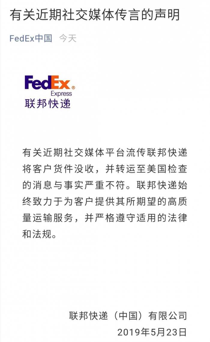 联邦快递中国公司随后在5月23日晚间对上述流言予以否认。声明称,社交媒体平台流传的“联邦快递将客户货件没收,并转运至美国检查”的消息与事实严重不符。联邦快递始终致力于为客户提供其所期望的高质量运输服务,并严格遵守适用的法律和法规。