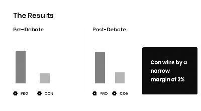 图片说明:辩论会现场,左边二人为正方的白邦瑞、麦克马斯特,右边为反方的马凯硕、王辉耀;辩论前后的投票情况,最终反方以2%的优势获胜。